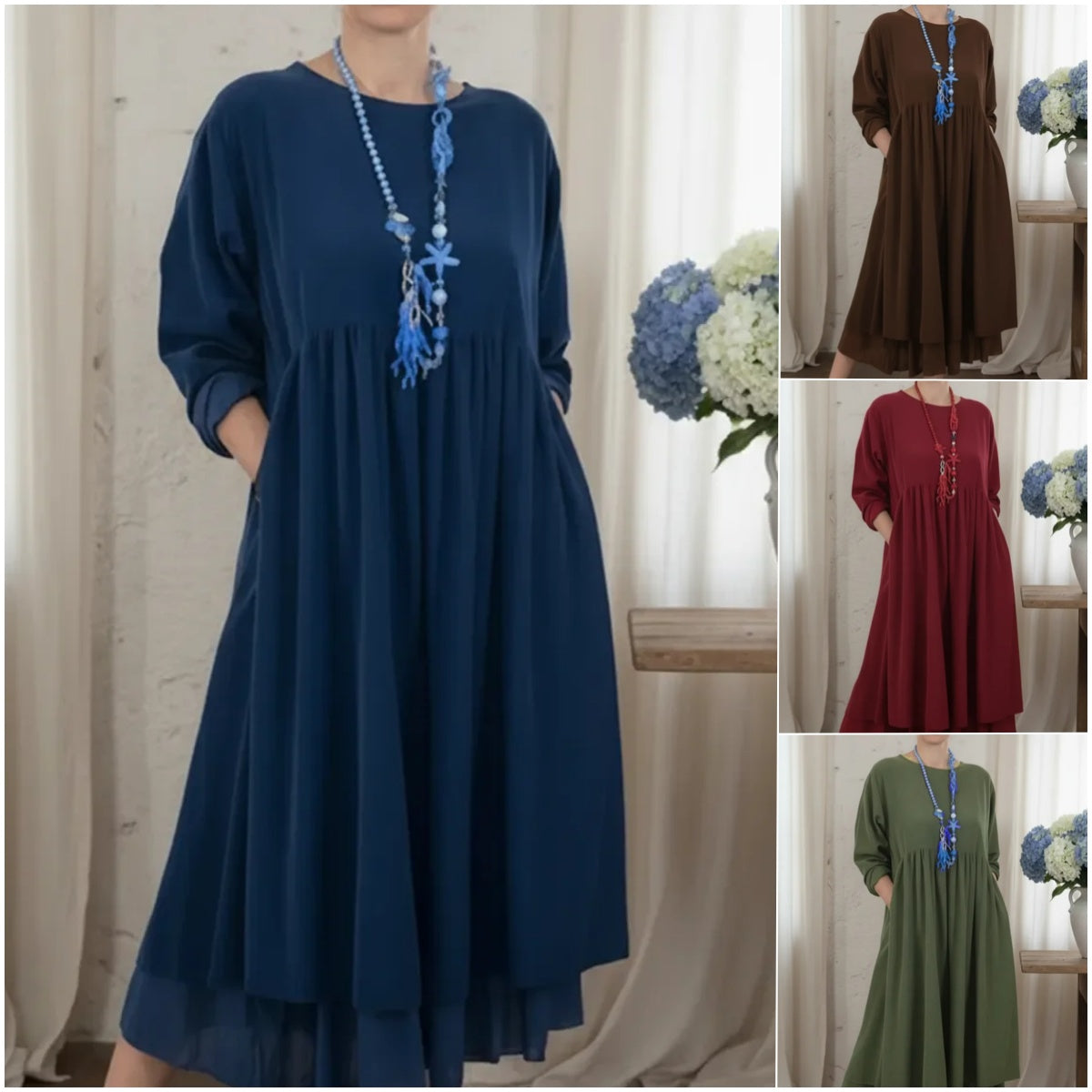 Ženska jednostavna, elegantna, široka midi haljina s dvostrukim rubom.